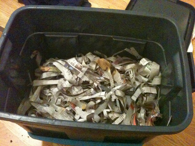 Then I started all over. I tore up some newspapers that I’ve been getting for free from starbucks. And put a the worms from tonite’s harvest in there with some food scraps and covered it with more paper and sprayed it down with a water bottle.